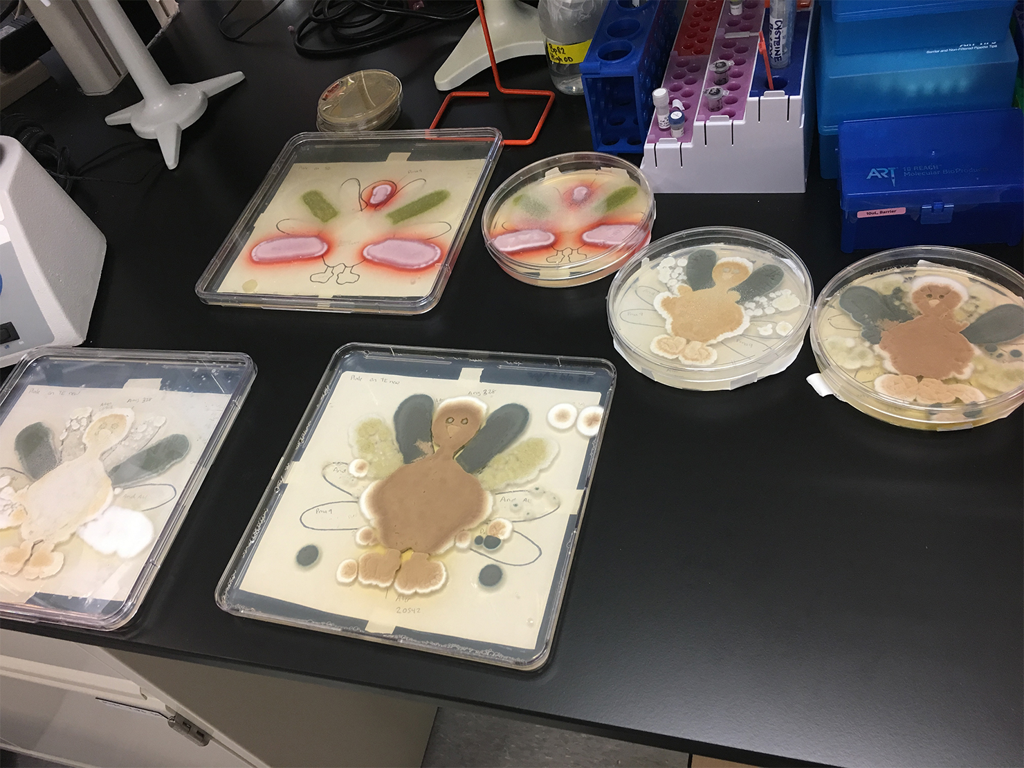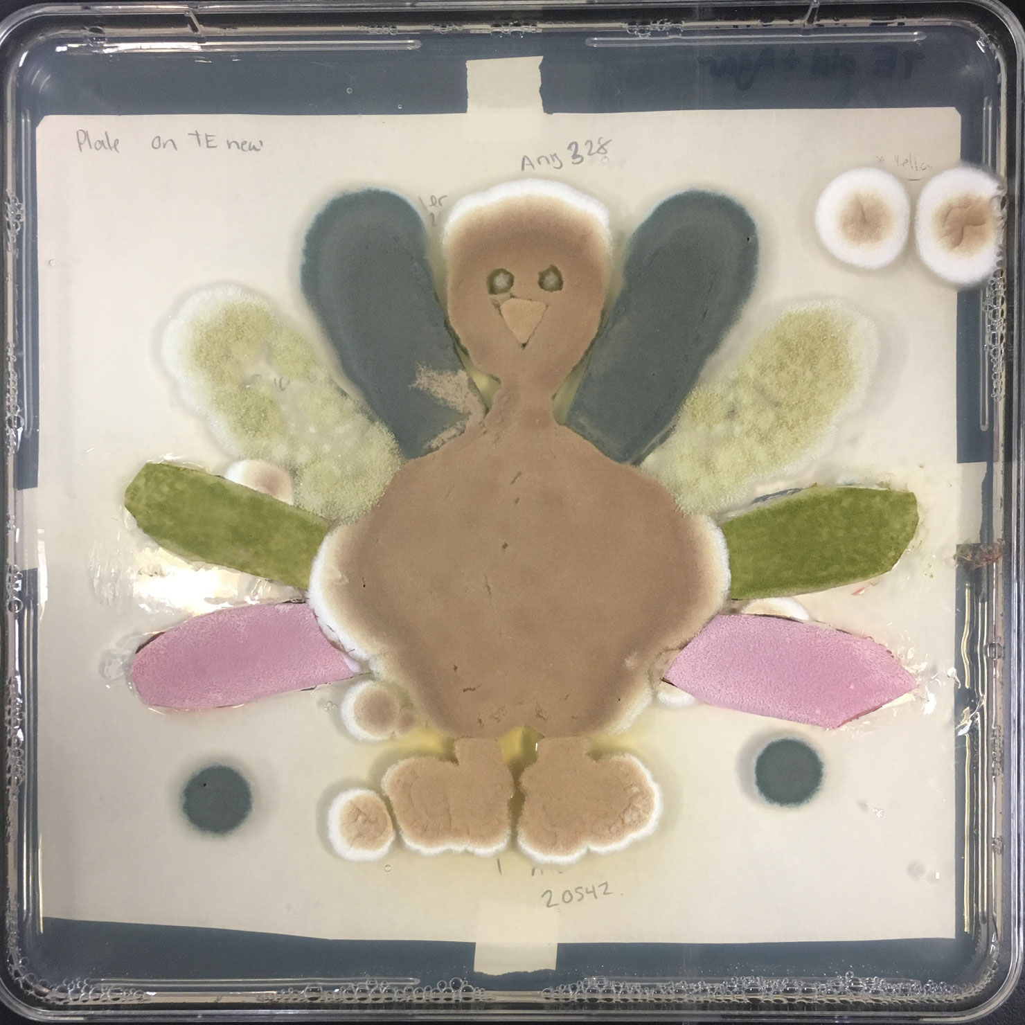 Start with a complex mixture of chemicals to make trace elements media. Sprinkle a little agar in there to get things solidified. Attach reference turkey art to the back of your plates. Pour media onto plates to about half full. Add in a little Aspergillus terreus to make the feet and beak. Throw in another variant of Aspergillus terreus to fatten up the body. This will create great flavor with a slightly different pigment. Sprinkle in a VERY small amount of Aspergillus niger to make noticeably dreamy, dark eyes. Don’t overdo this one, it will completely take over if too much is added. For rich feathers use Aspergillus fumigatus and Aspergillus oryzae. Make sure these are fresh. If these are old they will result in diluted, spotty flavor. Let your turkey grow and mature at room temperature for several days. If your turkey needs a little boost you can warm it up to 37°C for a day or two.