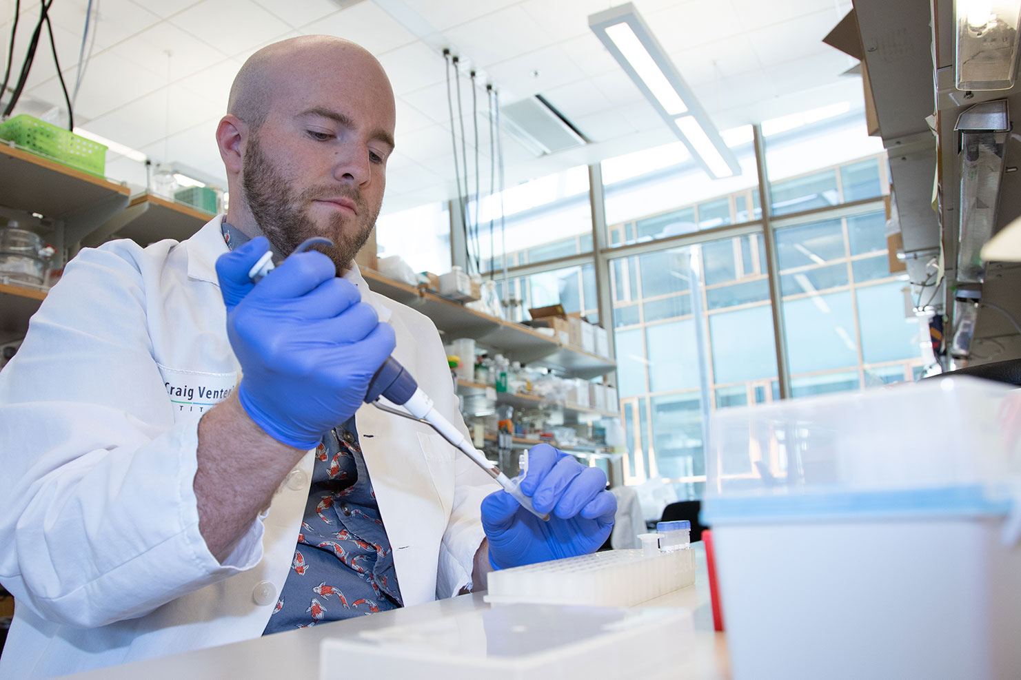 Scripps and JCVI graduate student Patrick Brunson pipettes Pseudo-nitzschia diatoms in the Andrew Allen Lab at the J. Craig Venter Institute. Credit: J. Craig Venter Institute.