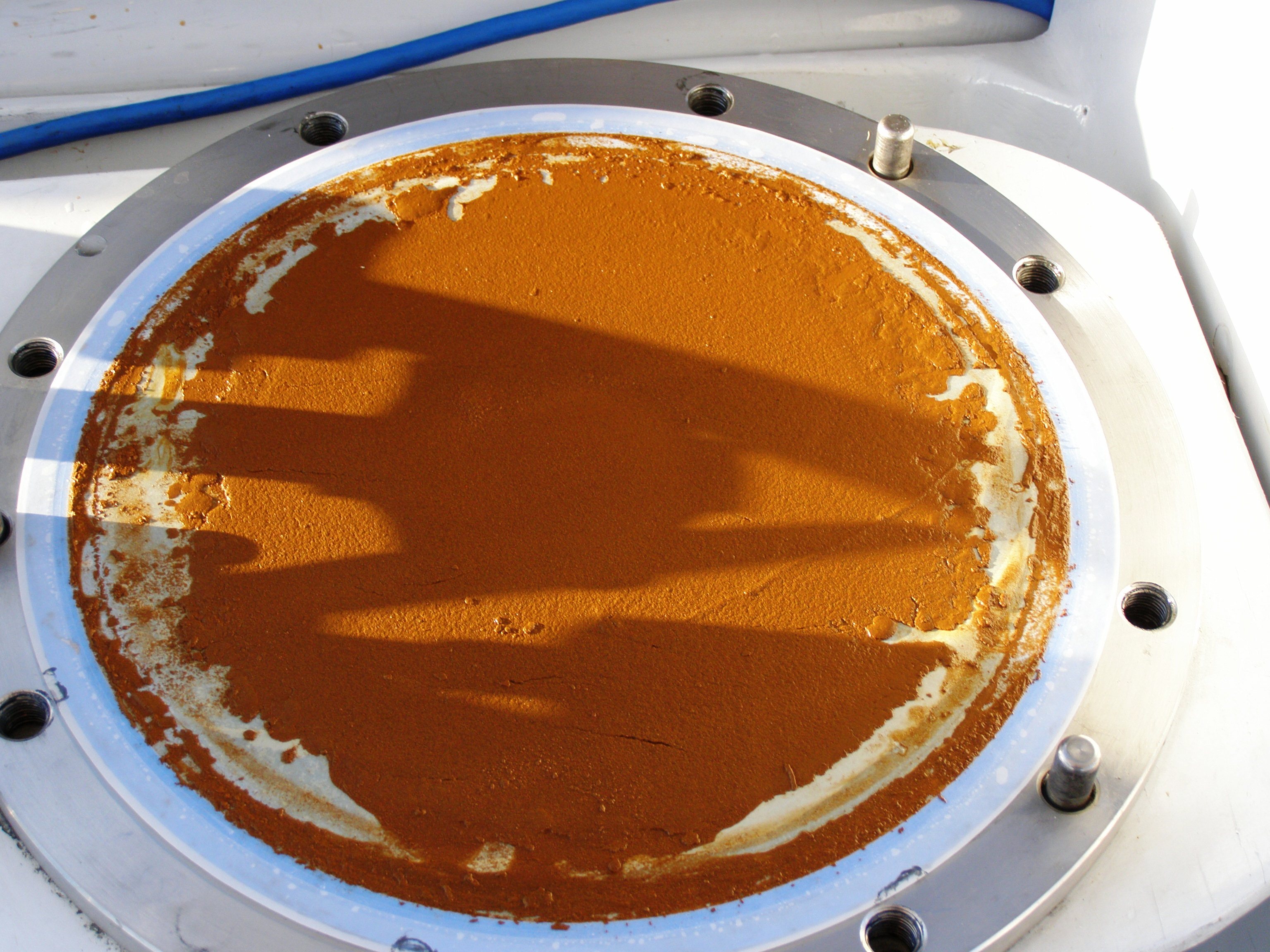 There were a couple samples we wanted to take in Santorini. The first was a deep sample in the middle of the caldera (Greek Sample #24 on the sample map). The second sample was in an area called Iron Bay. Iron Bay is called Iron Bay…you guessed it, because of all the iron in the water! As you go into the bay the water turns a brownish orange color, the rocks on the shores are the same color. Iron Bay is a thermal vent so you can see the bubbles coming up the water column, you can smell the sulfur and the water temperature goes from 24 -32 C (75-90F). This is going to be a very interesting sample!
