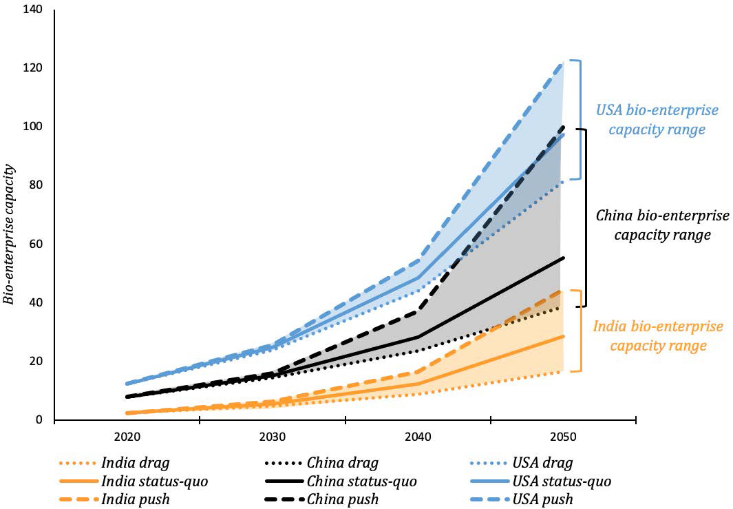 In the case of the U.S., even though its GDP (measured as purchasing power) is about three-quarters the size of China’s (due to China’s far larger population), the US’ bio-enterprise capacity score is over fifty percent larger. However, China’s authoritarian government has the potential to more rapidly implement policy changes than the U.S. and other democratic countries, giving them the ability to close the gap or overtake the U.S. leadership position.