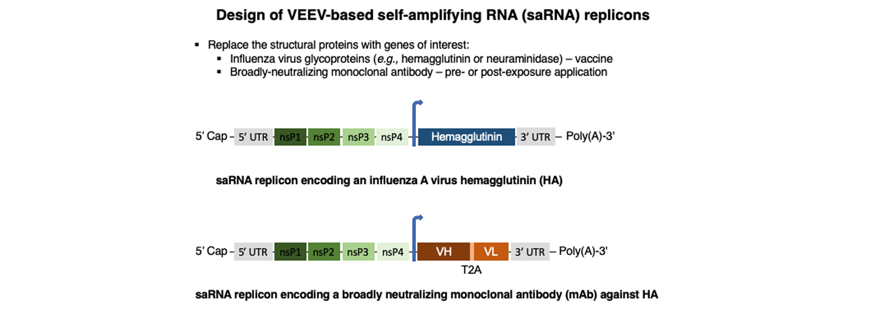 Here, we will investigate the viability of using a self-amplifying RNA amplicon expressing key antigens from influenza A or B viruses as a basis for an influenza vaccine. The idea is to generate a safe influenza vaccine that will elicit a robust and long-lasting immune response. In parallel, we will also explore the use of an RNA self-replicating amplicon expressing a broadly protective monoclonal antibody for use as a pre- and post-exposure prophylaxis against infection.